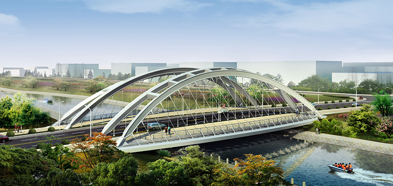肋下承式梁拱組合體系橋,橋跨 70 米,寬度 33.5-42.9 米;聚賢橋路南橋為上承式梁拱組合橋,橋跨組合為